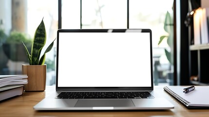 Real photo of bright room interior with wooden desk with lamp, notebooks and empty screen computer standing by the window