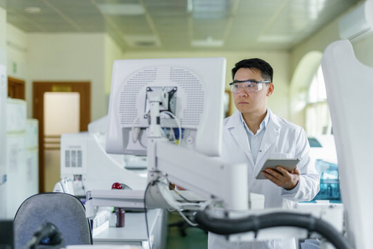 Scientist analyzing data in laboratory with computer technology