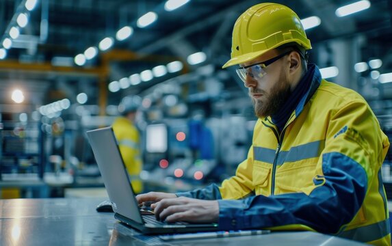 Focused craftsman uses laptop among industrial workshop tools