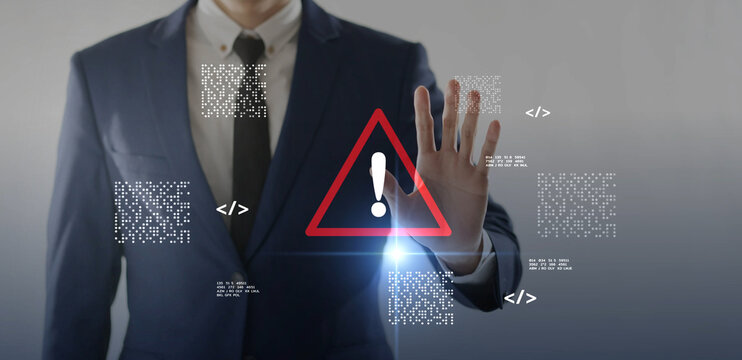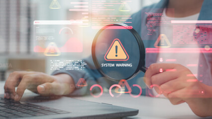 System warning alert on virtual interface with hand interaction. Concept of cybersecurity risk, data breach, malware, hacking, IT failure, and digital system vulnerability in modern technology.