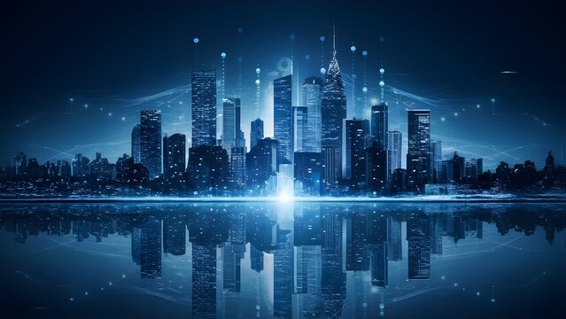 Unique city horizon with computerized impacts, enlightened specks, on an intelligent background, idea of technology