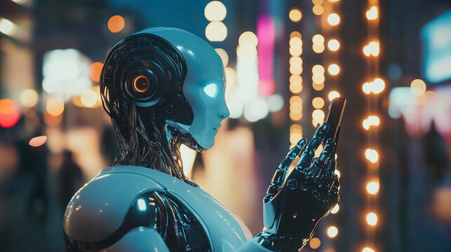 Futuristic humanoid robot using smartphone in a vibrant urban setting