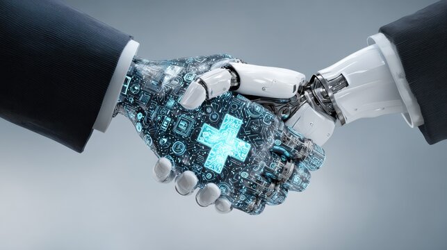 human and robot handshake symbolizing advanced ai integration in future healthcare technology with digital medical icons