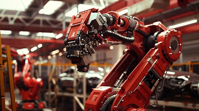 Robotic arm operating in a modern high tech factory environment demonstrating the power of automation and technological advancement in industrial manufacturing and production processes
