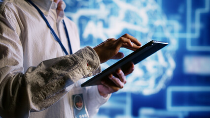 Qualified admin works with artificial intelligence computerized model simulating human brain. Proficient expert looks at AI visualization showing machine learning algorithms using pattern recognition