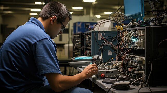Manager supervising technician in industrial plant using PC software to diagnose malfunctions. Factory team leader working with coworker to coordinate repair tasks on assembly lines, camera A