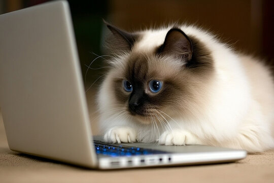 Cat engages with laptop, showcasing modern technology in a cozy indoor setting