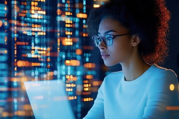 A person sits behind a laptop with dramatic lighting casting shadows on the walls,