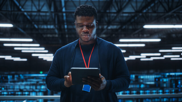 Portrait of a Data Center Engineer Using Laptop Computer. Server Room Specialist Facility with African American Male System Administrator Working with Data Protection Network for Cyber Security.