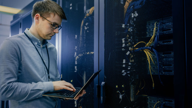 In Data Center IT Engineer Stands Before Working Server Rack Doing Routine Maintenance Check and Diagnostics Using Laptop. Visible Computer Hardware Equipment, Broadband Fiber Optic Cables LED Lights.