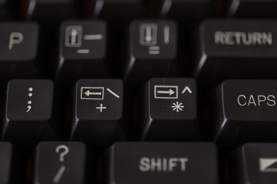 Close-up of vintage computer keyboard showing arrow keys, symbols, and command markings, ideal for retro tech projects, hardware documentation, and computing history materials.