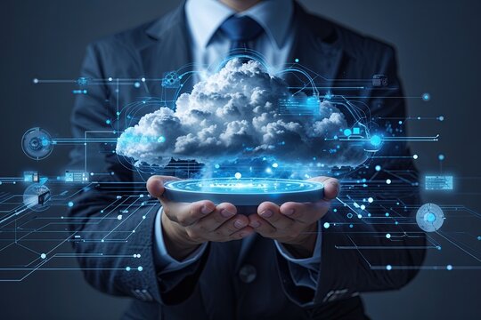 A digital representation of data and analytics icons floating above fluffy clouds, symbolizing cloud computing and technology.