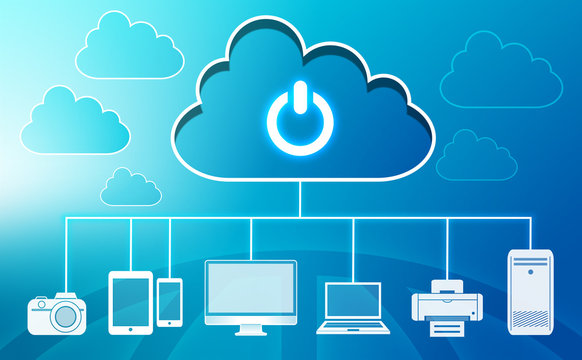Visual representation of cloud computing with storage servers under a white cloud on a blue backdrop