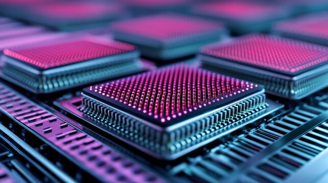 Elegant A quantum computing lab with an array of interconnected photonic chips glowing under ultraviolet light symbolizing the future of computing