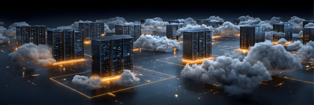 cloud computing infrastructure with connected servers, glowing data lines, digital sky background, futuristic visualization