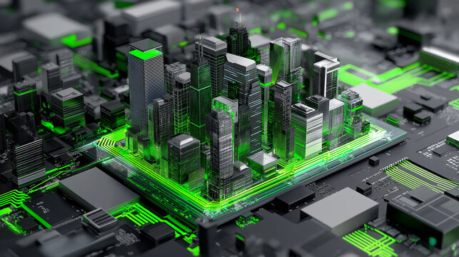 A futuristic cityscape rises from a glowing circuit board symbolizing digital infrastructure and smart technology.
