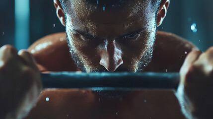 Focused young man lifting dumbbell in strength workout