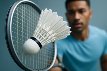 Close-up of shuttlecock hitting badminton racket with player in background, representing precision and focus in sport training concept. Ai generative