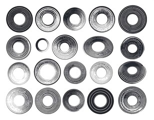 A collection of various concentric circles with textured black lines on a white background