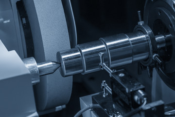 The cylindrical grinding machine with cam shaft part.Hi precision manufacturing for automobile part.