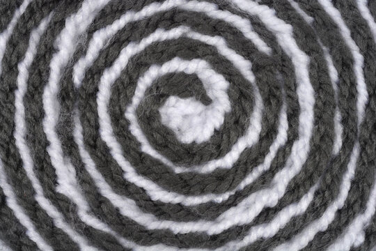 The texture of dark grey and white yarn is arranged in a spiral, full-frame concentric pattern