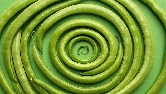 A vibrant overhead close-up captures numerous long, slender green beans artfully arranged in concentric spirals against a matching green backdrop.  The image showcases a visually appealing pattern