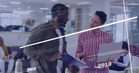 Image of data processing and diagrams over diverse colleagues discussing work