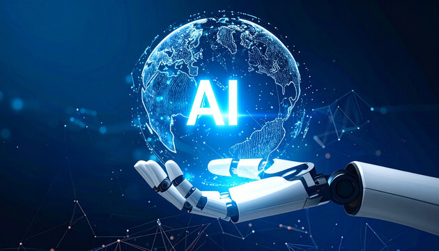 The AI robot hand is holding a glowing globe with AI text. This signifies the growing influence of artificial intelligence in our world and technological advancement