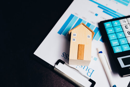Wooden house model on business report with calculator and pen representing property investment and financial planning concepts