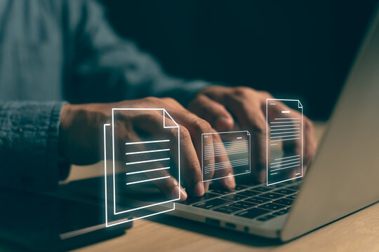 Conceptual image representing a digital data management system, network, or cloud computing service, with holographic documents and a folder displayed above a hand. document