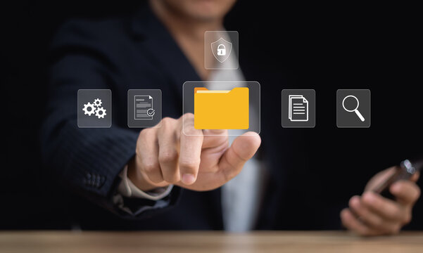 Document management concept.Online document database, Virtual screen icons software for efficient archiving, searching and management of company files and data.
