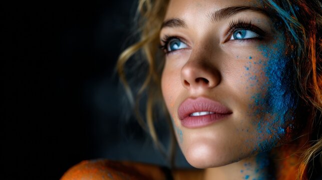 Close-up portrait of woman with blue paint for artistic beauty campaign, creative expression or editorial fashion content imagery