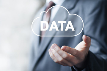 Businessman pressing button data cloud network on virtual digital electronic user interface