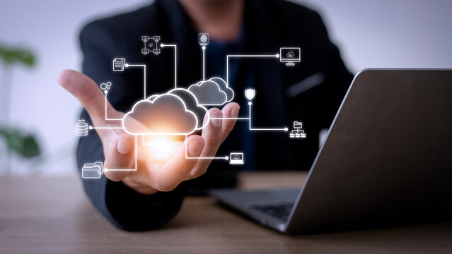 Businessman with cloud computing diagram show on hand. Cloud technology. Data storage. Networking and internet service concept.
