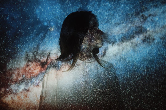 Silhouette with floral overlay on blue background.