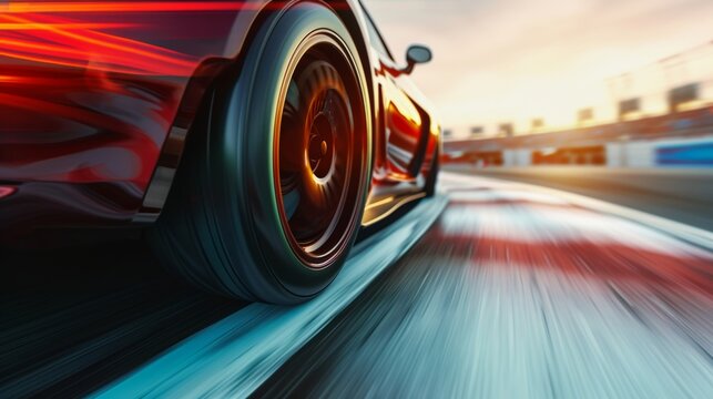 A closeup of a cars tires spinning rapidly causing a blur of motion as it speeds down the track
