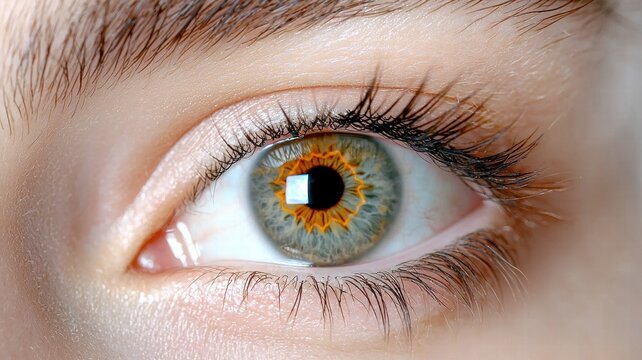 A close-up of a human eye showcasing vibrant colors, including hues of green and orange, with defined eyelashes and a clear cornea.