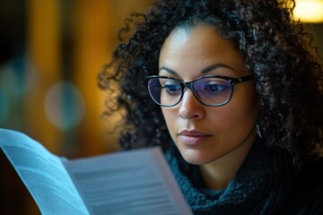 Young Woman Reading Papers with Intense Focus