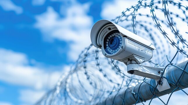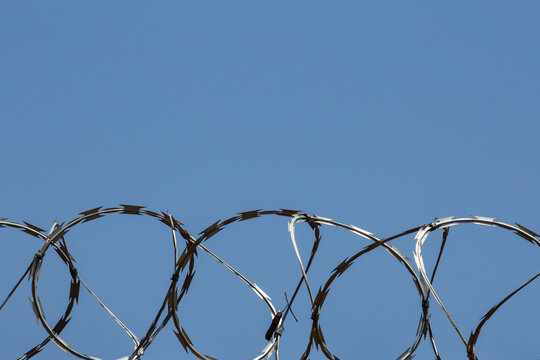 Razor barbed wire or concertina razor coil barrier security fence restricted security area in airport. Neural network ai generated
