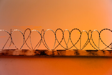 Sharp concertina wire coiled along a rusted fence at sunset, symbolizing security, restriction, and boundaries with dramatic depth and warm light contrast.