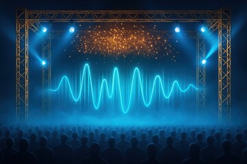 Virtual Concert Stage With Glowing Sound Wave and Immersive Light Show. A futuristic concert stage displaying a bright sound wave over a virtual audience, symbolizing immersive audio, sound design, d
