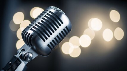 Vintage Microphone on Stage with Blurred Lights in the Background for Music Concert or Performance Event Promotional Use