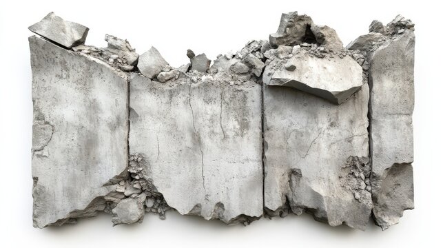 A pile of grey rubble, broken concrete and debris isolated on white background.