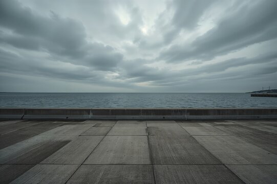 Intense shoreline view featuring a solid concrete wall, paved area, vast water expanse, and cloudy sky