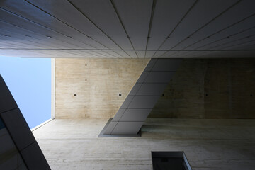 Minimal wood alcove with concrete wall, sunlit shadow geometry and clean timber paneling