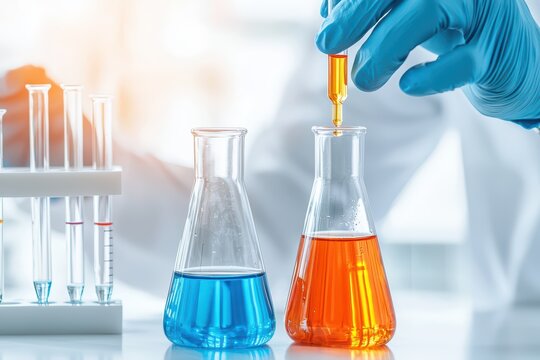 Scientist wearing gloves using a dropper to mix liquids in laboratory beakers, bright and colorful setting.