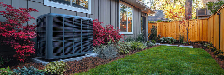 A condenser unit in a residential setting, designed for energy-efficient cooling, installed next to a well-manicured lawn