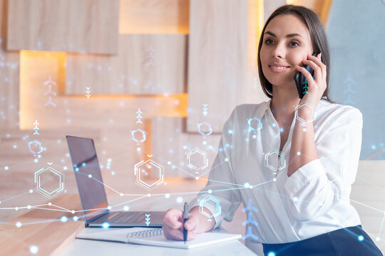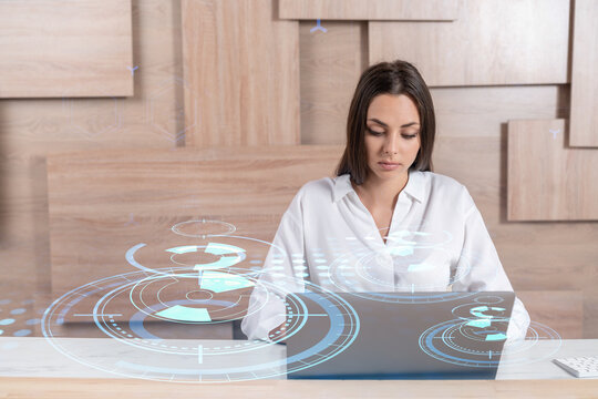 Attractive businesswoman in white shirt at workplace working with laptop to optimize development by implying new technologies in business process. Hi tech hologram over office background