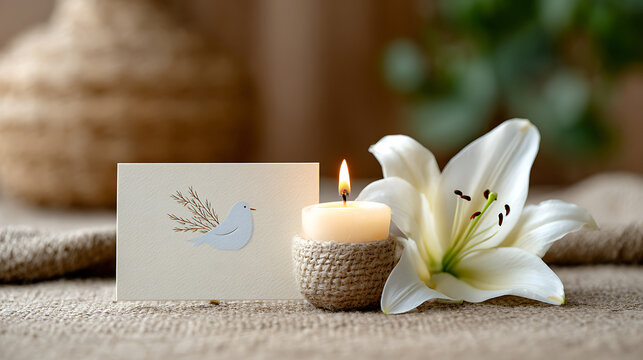 A minimalistic sympathy greeting card with a delicate dove beside a lit candle and a white lily symbolizing peace and remembrance
