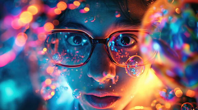 Young Scientist: With Glasses, Conducting Playful Experiments with Animated Bubbles and Colorful Reactions in a Backyard Lab